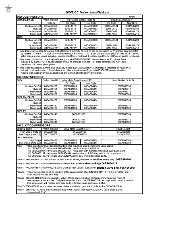 CARRIER MODEL 06CC VALVE PLATE AND GASKET PART NUMBERS